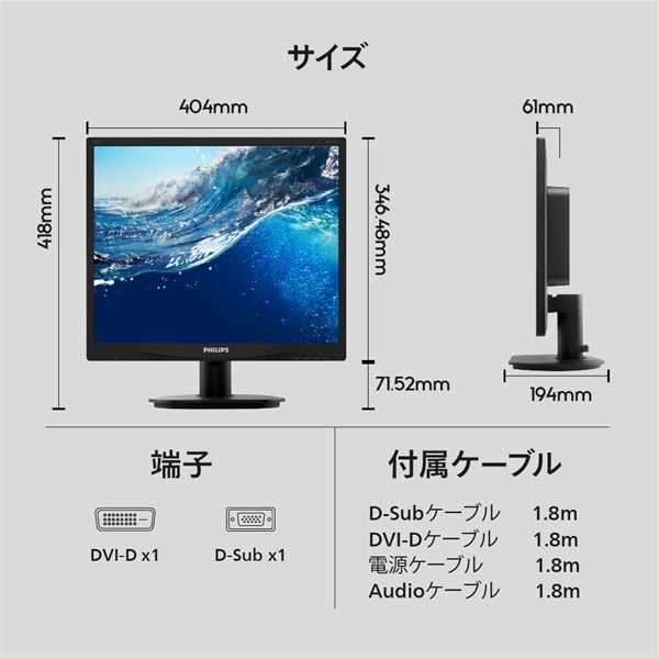 | 付属品(モニタ / 電源ケーブル) | Dsub cable 1.8M DVI-D cable 1.8M Power cable 1.8M Audio cable 1.8M |