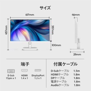 | 付属品(モニタ / 電源ケーブル) | Dsub cable 1.5M、HDMI cable 1.8M、DP cable 1.8M、Audio cable 1.8M、Power cable 1.8M |