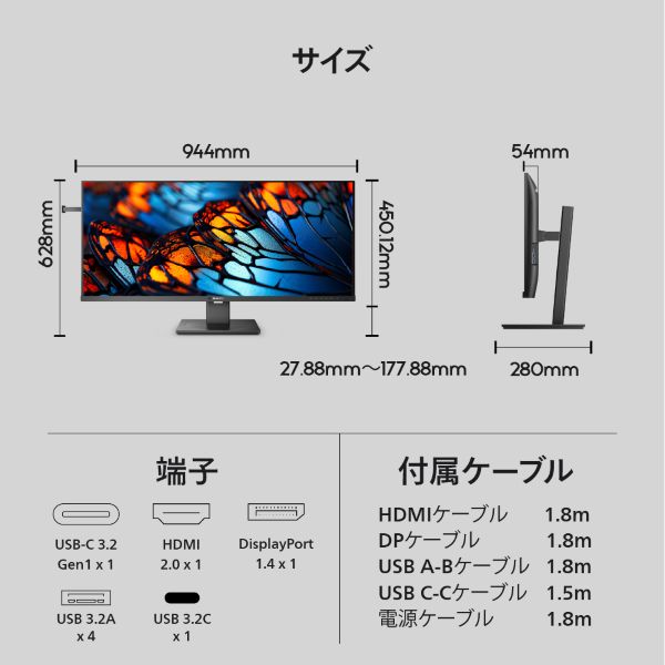 | 付属品(モニタ / 電源ケーブル) | HDMI cable 1.8M、DP cable 1.8M、USB Type C-C cable 1.5M、USB cable A-B 1.8M、Power cable 1.8M |