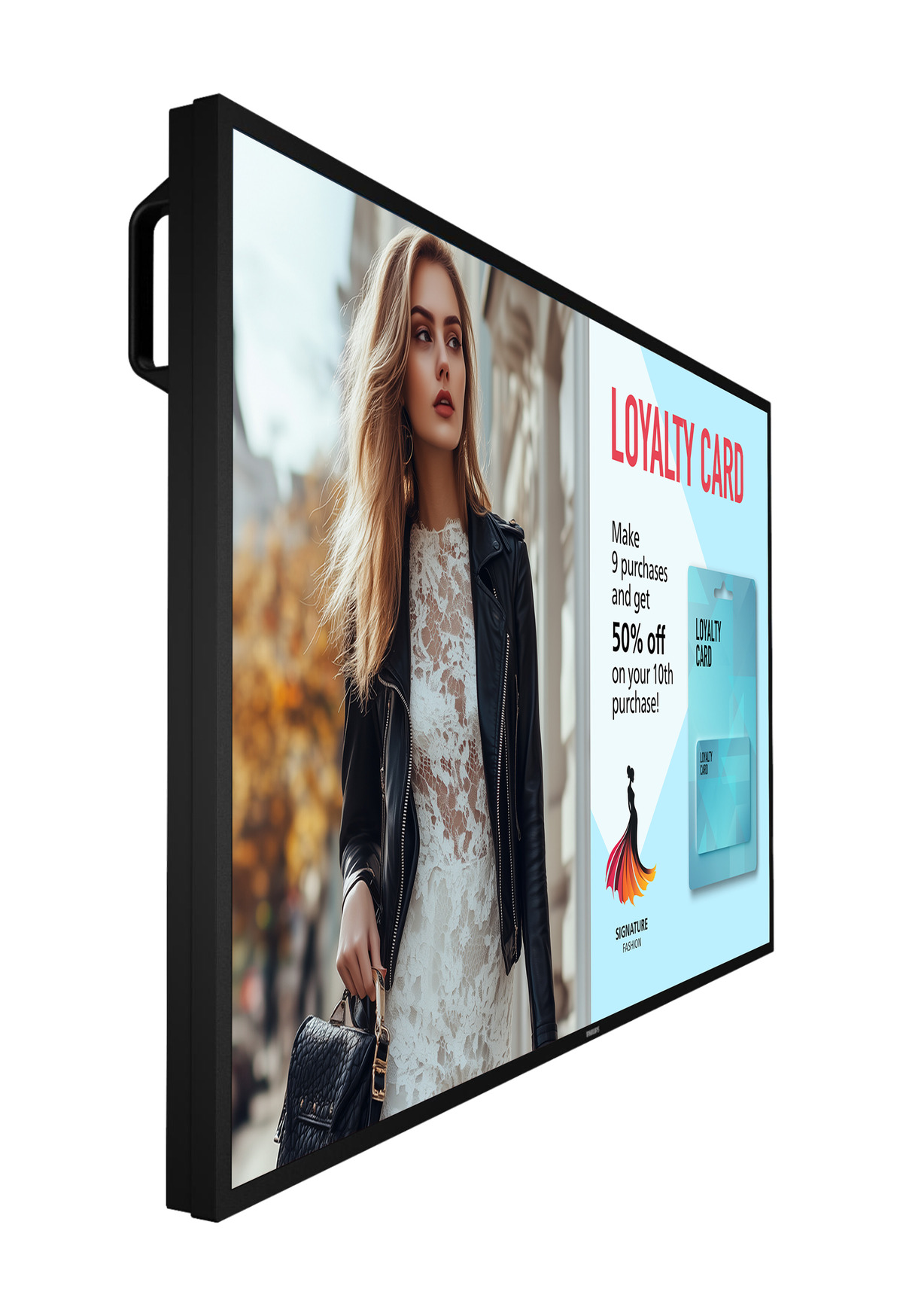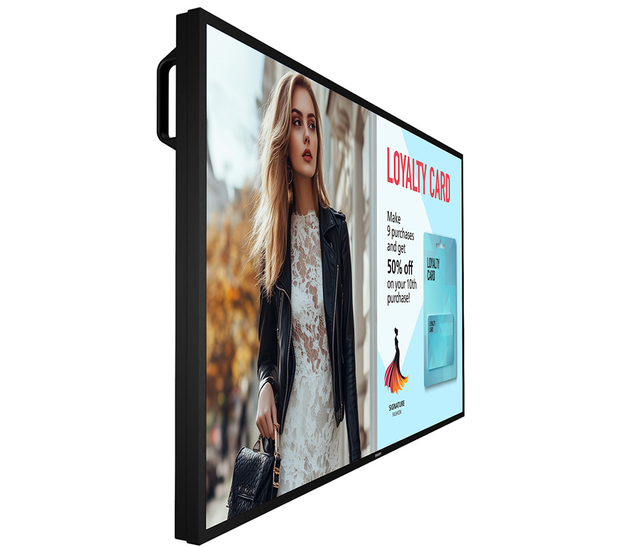 43 インチ、50 インチ、55 インチ、65 インチのサイズバリエーションを揃え、縦向きや横向きなど多様な取り付け方法に対応します。